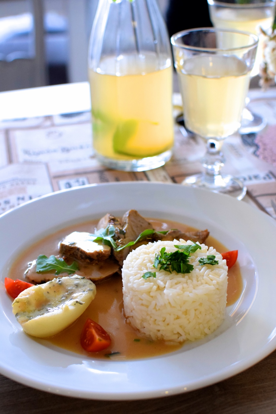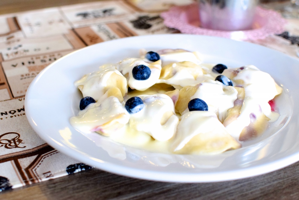 Kukmania to świeżynka na kulinarnej mapie Wrocławia – istnieje może z 1,5 miesiąca, ale z tego, co zdążyłam zauważyć, skradła serca wielu mieszkańców, o czym mogą świadczyć choćby mocno obłożone stoliki szczególnie w porach popołudniowych. Skuszona ciekawą nazwą i oryginalnym wystrojem, udałam się tam jakiś czas temu z Pawłem na obiad. Zdecydowaliśmy się na: zupę ogórkową, krem pomidorowy, naleśniki oraz carbonarę. Wszystko było absolutnie przepyszne. Na czele z moimi słodkimi naleśnikami, które co prawda znajdują się w menu dla dzieci, ale zaręczam, że to porcja, którą najedzą się także dorośli. W trakcie dzisiejszej wizyty zdecydowaliśmy się z kolei na pierogi z jagodami oraz polędwiczki w sosie musztardowo-miodowym z ryżem, gruszkami i serem pleśniowym. Do tego kompot domowej roboty. PY-CHO-TA.