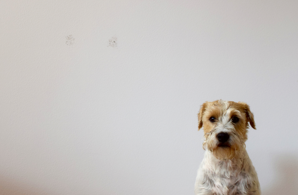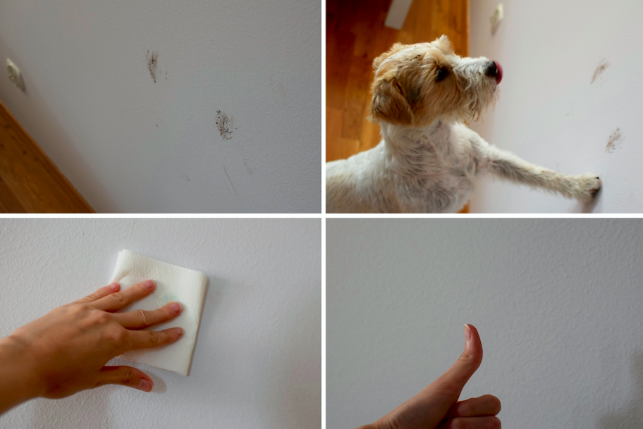 Producent zapewnia, że farba tworzy na zewnątrz matowe powłoki utrudniające plamom wnikanie w głąb powierzchni. Co w języku ludzkim oznacza, że oto można organizować w domu szalone imprezy z polewaniem się szampanem/czerwonym winem włącznie, podtapiać kwiaty i pozwalać zwierzętom oraz dzieciom na bycie sobą. Sprawdzone osobiście, działa. Plamy ewakuują się, niczym ja, kiedy zbyt długo czekam w poczekalni u dentysty. Swoje hydrofobowe działanie farba uzyskuje po 28 dniach, co też postanowiłam sprawdzić. O pomoc w przeprowadzeniu testu poprosiłam swojego asystenta, który wzorowo wykonał powierzone mu zadanie. (Swoją drogą nazywamy Elvisa Parsonem Błotnistym, bo chodzenie po grząskich nawierzchniach i kałużach to jedne z jego ulubionych czynności). Pograliśmy w mieszkaniu w piłę, do czego specjalnie nie trzeba było go zachęcać i dałam mu poskakać po ścianach. Na początek zaczął całkiem delikatnie i powiedziałabym nawet, że z wyczuciem estetyki, ale jak się potem rozkręcił, to zaczęłam żałować eksperymentu. (Co, jak nie zejdzie?! A może to ściema?). Moje obawy były uzasadnione o tyle, że wybrałam sobie najbardziej reprezentacyjną ścianę na środku pokoju, nie żeby gdzieś za drzwiami – ja naprawdę nie uznaję półśrodków. Na szczęście przy użyciu ręcznika papierowego wszystko zeszło i nie ma śladu (to też zabiło ostatni argument przed oszczędzaniem komarów).