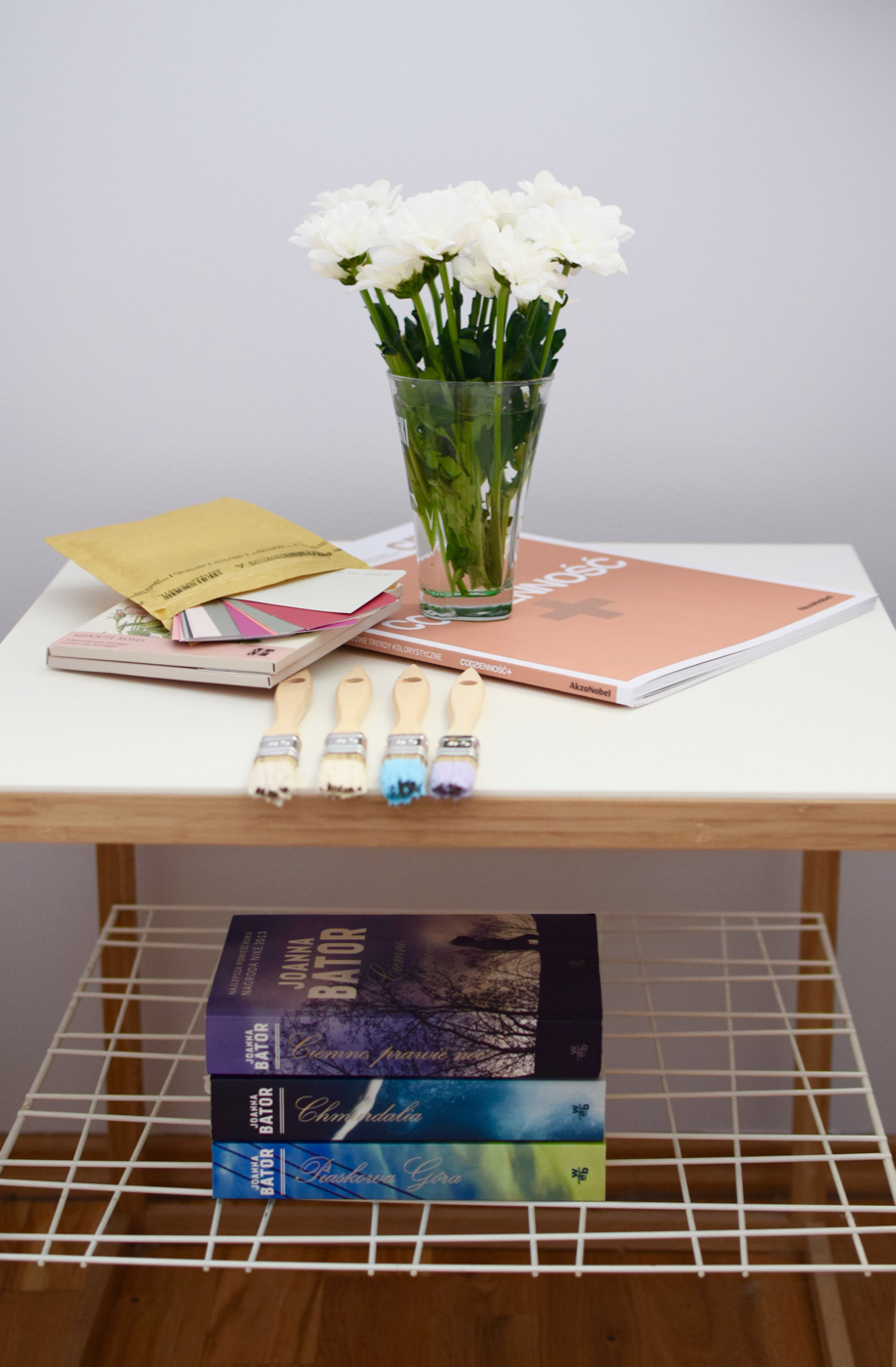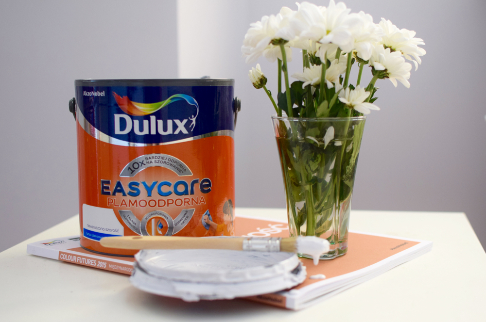 Od ostatniej przeprowadzki aktualne miejsca zamieszkania zaczęłam traktować dość tymczasowo, o czym świadczy choćby garstka książek, które mam przy sobie. (Umówmy się – książki to dla mnie świętość, ale do licha, czemu przy przenoszeniu z miejsca na miejsce stawiają taki opór?). Rozwiązania tymczasowe, jak to często bywa, zostały z nami na stałe, łącznie z preferencjami poprzednich właścicieli. Kiedy więc dostałam od Duluxa możliwość wyboru koloru plamoodpornej farby EasyCare, fajnie – pomyślałam. Ściany nie mają ze mną lekko, szczególnie latem, kiedy wieczorami urządzam rytualną rzeź komarów. Albo wtedy, gdy w ramach strajku generalnego rzucam w nie przedmiotami. Albo, gdy gramy z psem w squasha. Decyzja odnośnie koloru to absolutnie najtrudniejszy krok – jak tu podjąć jednogłośną decyzję, kiedy nazwy takie apetyczne, a dodatkowo swoją wymarzoną barwę można stworzyć także za pomocą mieszalnika (a wtedy to już hulaj dusza, piekła nie ma – świat kolorów stoi przed nami otworem). Na szczęście poszło mi całkiem nieźle – ostatecznie postawiłam na odcień Niewzruszoną szarość, dostępny w gotowej palecie barw (pal licho z odcieniem, oczywiście, że uwiodła mnie sama nazwa).